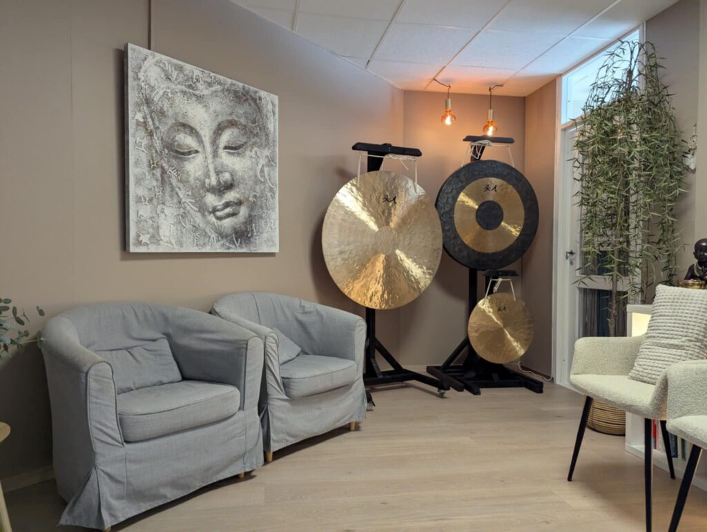 Deltakerne sitter behagelig i en stol under sesjonen, og vil via guidet meditasjon bringes i en avslappet tilstand før lydbadet starter.